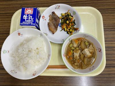 ご飯、赤魚の西京焼き、小松菜のおかか和え、大根と生揚げのそぼろ煮、牛乳