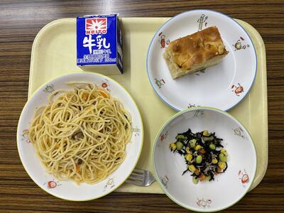 和風スパゲティ、ささみとひじきのサラダ、りんごのケーキ、牛乳