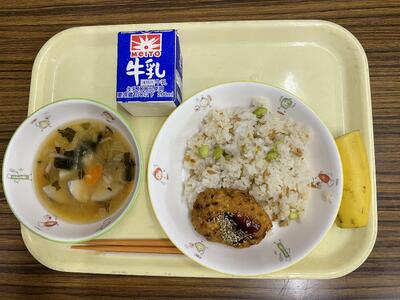 鮭と枝豆のご飯、れんこんつくね、野菜たっぷり味噌汁、バナナ、牛乳