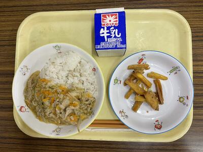 麦ご飯、生揚げの卵とじ丼、ごぼうサラダ、野菜スープ、牛乳