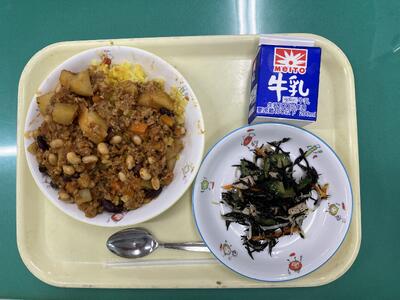 ターメリックライス、チリコンカン、ひじきのマリネ、牛乳