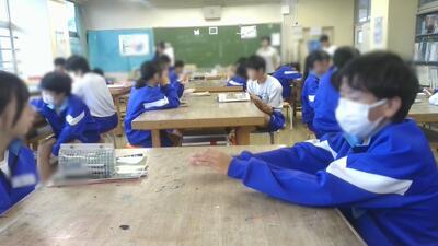 今日の英語は班対抗団体戦で、お互いに1名ずつ出て、お互いに英語の問題を出し合って勝ち抜き戦を行っていました。問題を作ること、その問題を答えることアウトプットのある主体的な授業でした。