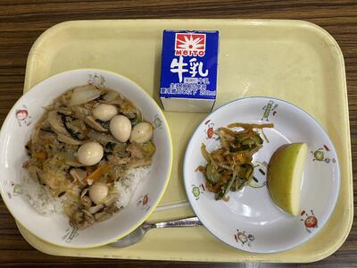麦ごはん、チキンと野菜の甘辛丼の具、卵とコーンのスープ、花ミカン、牛乳