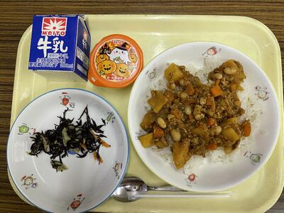 麦ご飯、チリコンカン、ひじきとツナのピリッとサラダ、ハロウィンデザート、牛乳