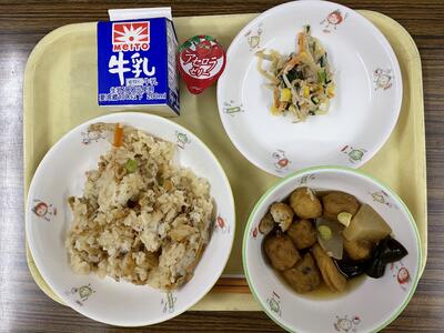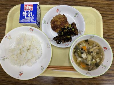 ひじきご飯、さといもコロッケ、根菜味噌汁、牛乳