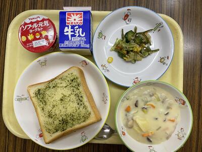 ガーリックトースト、ツナと茎わかめのサラダ、秋のクリームシチュー、ヨーグルト、牛乳
