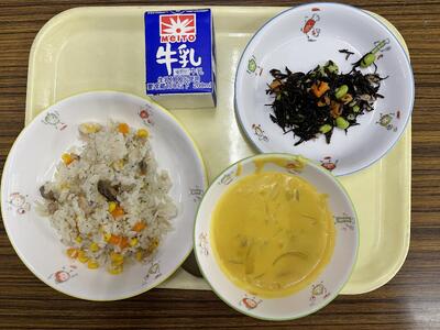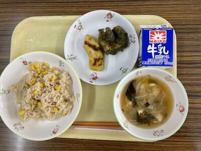 コーン茶めし、いかの天ぷら、かぼちゃの天ぷら、豆腐のみそ汁、牛乳