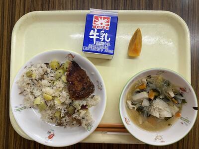さつまいもご飯、かつおの竜田揚げ、野菜たっぷり味噌汁、柿、牛乳