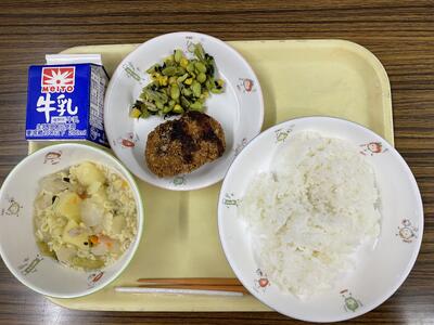 ご飯、キャベツメンチ、コーンと枝豆のソテー、ABCスープ、牛乳