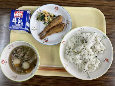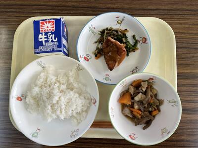 ご飯、さんが焼き、ひじきの梅煮、千葉県産野菜の味噌汁、牛乳