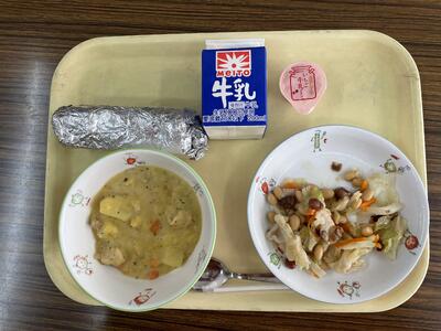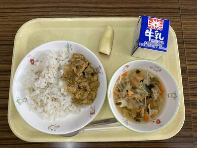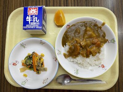 麦ごはん、チキンカレー、小松菜とこんにゃくのサラダ、愛まどんな、牛乳