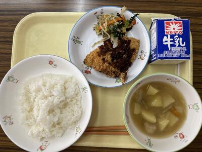 ごはん、アジフライ、ごま酢和え、はっぽう味噌汁、牛乳