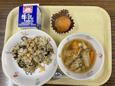 鮭ピラフ、チーズ入りコーンポテト、キャベツスープ、ひとくちりんごゼリー、牛乳