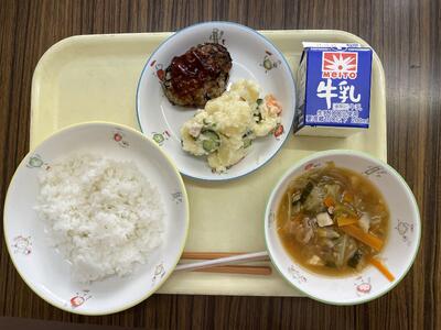 ごはん、れんこんのハンバーグ、ポテトサラダ、キムチ鍋汁、牛乳