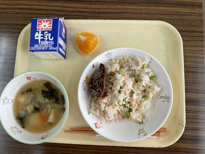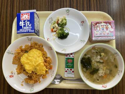 チャーハン、中華オムレツ、キムチスープ、ひとくちみかんゼリー、牛乳