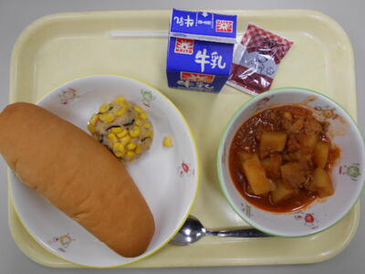 コッペパン・牛乳・チョコクリーム・コーンの鹿の子蒸し・ポークビーンズ