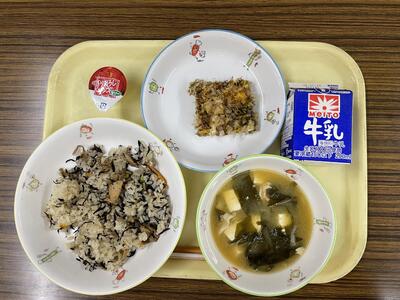 ひじきご飯、お好みオムレツ焼き、なめこの味噌汁、ひとくちりんごゼリー、牛乳