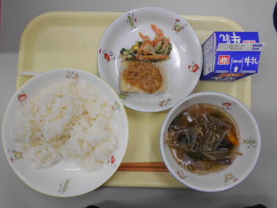 ごはん・牛乳・高野豆腐のピリ辛そぼろあんかけ・ごまマヨ和え・もやしの具だくさん汁