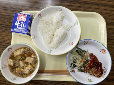 ごはん、ヤンニョムチキン、もやしナムル、中華五目豆腐、牛乳