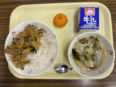 麦ごはん、キムチ丼の具、ワンタンスープ、冷凍みかん、牛乳