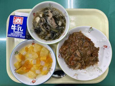 麦ごはん、ホイコーロー丼の具、キムチスープ、フルーツ入りクラッシュゼリー、牛乳