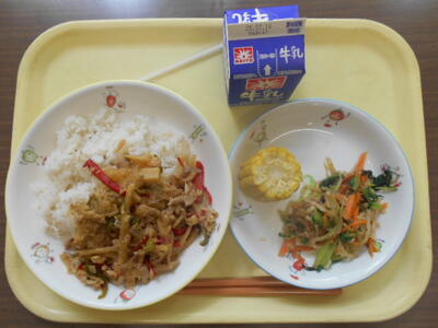 麦ごはん・チンジャオロース丼の具・豆苗の中華和え・とうもろこし・牛乳