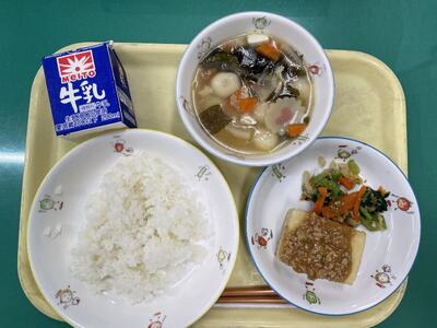ご飯、高野豆腐のピリ辛そぼろあんかけ、ツナ和え、白玉汁、牛乳