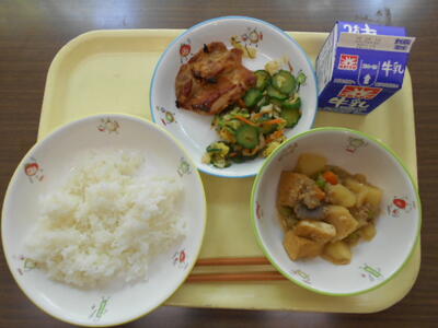 ごはん・牛乳・鶏肉のみそ照り焼き・白菜ときゅうりの塩昆布和え・新じゃがそぼろ煮