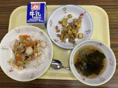 麦ごはん、豆腐チゲ丼の具、わかめスープ、大豆・じゃこ・いもの揚げ煮、牛乳