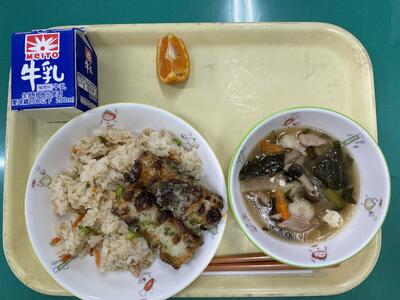 こぎつねご飯、竹輪の磯部揚げ、だまこ汁、小夏、牛乳