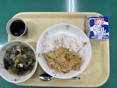 麦ご飯、あぶたま丼の具、わかめスープ、ぶどうゼリー、牛乳