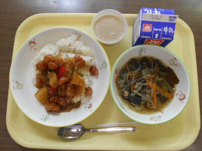 麦ごはん・牛乳・チキンと野菜の甘辛丼の具・もやしとわかめのスープ・カフェオレゼリー