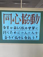 一年生の校外学習のスローガンです。「全員が同じ気持ちで一緒に頑張ろう」みたいな意味でしょうか。ちなみに「きょうどう」という漢字には、「共同」「協同」「協働」等があり、どれも同じように思われますが、微妙に意味が違うようです。一度調べてみてはいかがでしょうか。一年生があえて「協働」という漢字を使った意味が分かると思います。