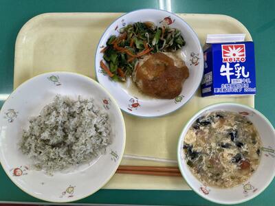 あおのりしらすご飯、おろしハンバーグ、トマトと卵のスープ、おひたし、牛乳