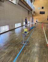 3年生の体育では、体育祭の練習が始まっています。写真は3年学年種目「ローハイド」の一場面です。この種目は、4人1組で騎馬戦のような騎馬を組み、上の人が、投げ縄のように先にボールの入った縄をグルグル回し、机の上に置かれた一斗缶(写真は体育館なのでかわりにバレーボールです)を倒して落とす。そして次の騎馬にバトンを渡す。という競技です。ボールがうまく一斗缶に当たればいいのですが、最初につまずくと意外に手こずったりします。本番は何組が早いでしょうか。これからの練習次第ですね。