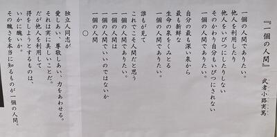 2階の渡り廊下に掲示されている、武者小路実篤さんの詞です。特別教室に行くときに何げなく通り過ぎている人も多いと思いますが、一度じっくり読んでほしいですね。「愛しあい、尊敬しあい、力をあわせる それは実に美しいことだ。だが他人を利用して 得をしようとするものは、いかに醜いか」