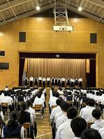 6時間目は生徒集会でした。旧部長さんから総体等の結果報告と新部長さんの紹介があり、新部長さんたちの決意表明がありました。また夏休みに市川市の代表としてドイツに派遣された2名の生徒によるドイツでの活動報告、榎祭(合唱祭)に向けた、実行委員長のお話等がありました。あっという間に夏休みが終わり、活動の中心は2年生になり、3年生は最後の榎祭が近づいてきました。時が過ぎるのは本当に早いものですね。
