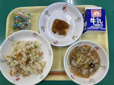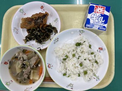 グリーンピースご飯、たらのから揚げ、のりおかか和え、豚汁、牛乳