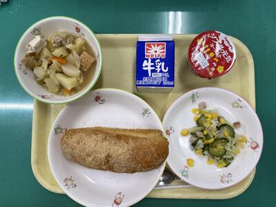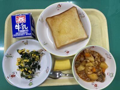 きなこ揚げパン、ハムコーンサラダ、洋風煮込み、ヨーグルト、牛乳