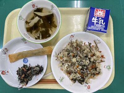 ピリ辛ごぼうご飯、ししゃものパリパリ揚げ、ひじきとツナのマヨ和え、若竹汁、牛乳