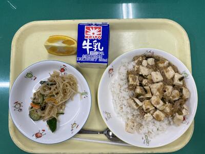 麦ごはん、マーボー豆腐、切干大根の中華和え、甘夏、牛乳