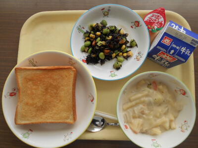 メープルバタートースト、ひじきのサラダ、マカロニのクリーム煮、ひとくちアセロラゼリー、牛乳