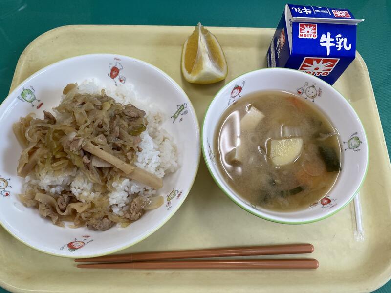 ご飯、豚丼の具、根菜味噌汁、河内晩柑、牛乳