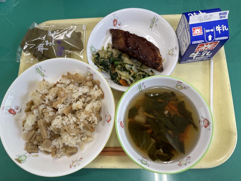 たけのこご飯、魚の竜田揚げ、ごま和え、すまし汁、柏餅、牛乳