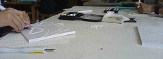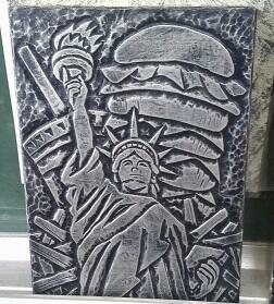 2年生は、メタルレリーフでテーマは「新生物」です。いまだに発見されていない新種の生物を、彫刻刀でレリーフにしてその上からアルミシートを貼り付けてスチールウールとコンパウンドで仕上げました。