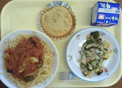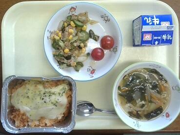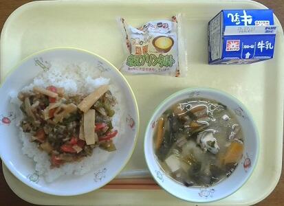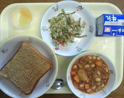 本日は、ココア揚げパン、チリ・コン・カン、茎わかめのサラダ、ヨーグルトでした。揚げパンは程よい甘さでココア風味が食欲をそそります。チリ・コン・カンはトマト風味の味が揚げパンの甘さと良く合います。茎わかめも歯ごたえがあってさっぱりしています。