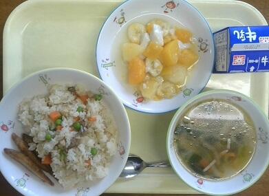 本日の給食は、ご飯・レバーとポテトのケチャップ和え・くまのおうちのスープ・しらたきソテー・果物(夢オレンジ)でした。ケチャップ和えは、レバーとポテトが食べやすい1口大になっており、ケチャップとのバランスも良くご飯との相性のいい献立です。スープはあっさりした味で野菜も豊富です。