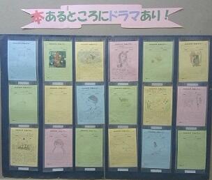 階段の壁には、今年度の1・2年生が美術の時間作成した作品が飾られています。1年生は、絵文字~漢字と絵の融合~で、漢字から連想される絵と、漢字をドッキングして新しい姿にしました。アクリル絵の具で丁寧に着色しています。