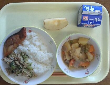 本日の給食は、ご飯・鮭の西京焼き・けんちん汁・かぼちゃのそぼろあんかけ・果物(りんご)でした。本日は「冬至献立」です。かぼちゃのそぼろあんかけは、柔らかいかぼちゃの上に少し甘いあんかけがかかっており、ご飯がどんどん食べれます。けんちん汁も優しい味で、心も体も温まりました。いよいよ給食も明日で終わりです。