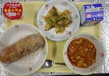 本日の給食は、ごま揚げパン、チリ・コン・カン、茎わかめのサラダ、ヨーグルトでした。揚げパンは、きなこの甘さに、ごまの香りと味が混ざり、とてもおいしくいただきました。茎わかめのあっさりとした味と、トマトの酸味のチリ・コン・カンも絶妙な味でした。
